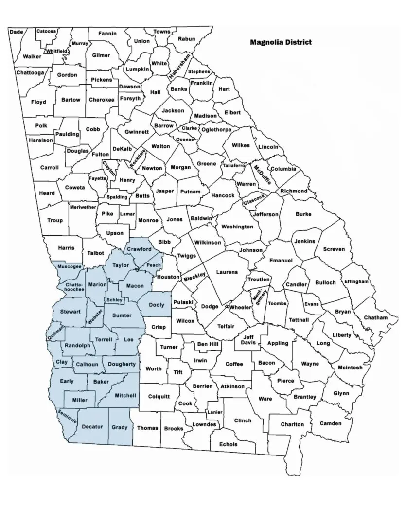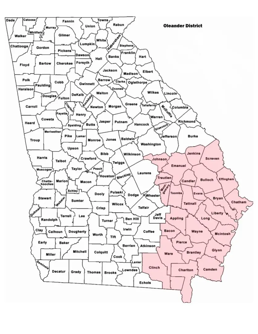 Our state has been divided into seven geographical districts, Azalea, Camellia, Dogwood, Laurel, Magnolia, Oleander, and Redbud. They carry out all of our programs in the state of Georgia.Â