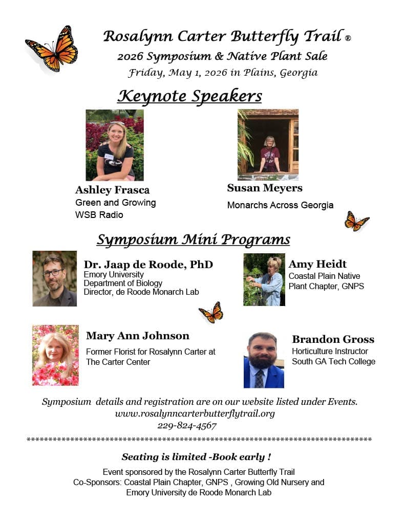 For more details visit: 2026 Rosalynn Carter Butterfly Trail Spring Symposium and Native Plant Sale – Rosalynn Carter Butterfly Trail