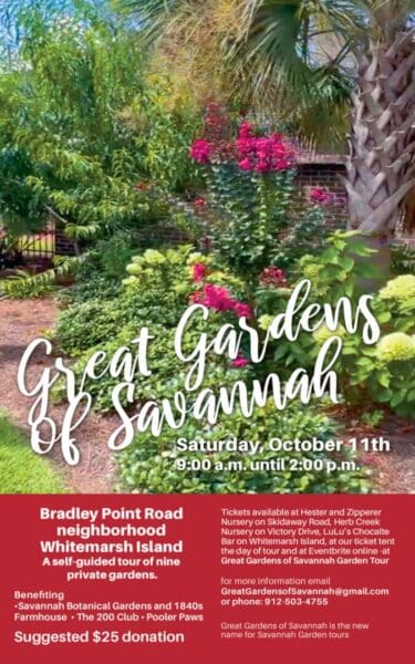 ![]() Get ready because The Great Gardens of Savannah Tour is almost here! Benefitting the Savannah Botanical Gardens and 1840s Farm House. We are proud to announce this amazing Fall event…