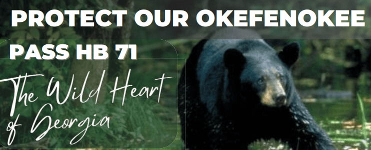 The Okefenokee Protection Act -House Bill 71 – – was sponsored by a bipartisan group of 90+ legislators in the Georgia Gen. Assembly. We need pressure to get it out of Committee and go to the Floor for a vote, be passed and then go to the Senate.
