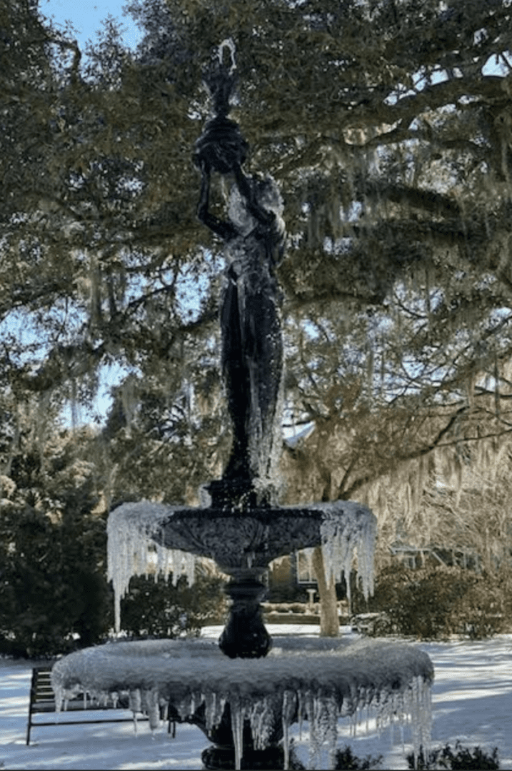 APCCGC – Ardsley Park/ Chatham Crescent Garden Club’s “The Garden Keeper” had icicles hanging from the edge of the fountain in Kavanaugh Park.